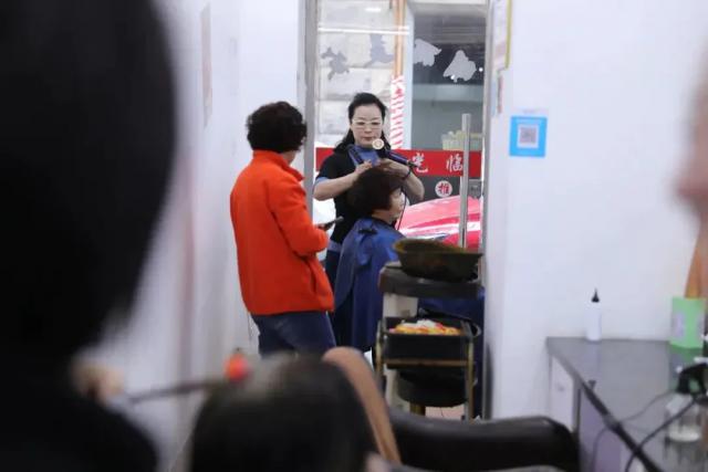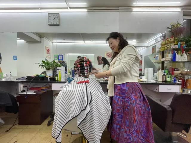 周明丽在帮客户烫头,彼此,人们交流都用上海话